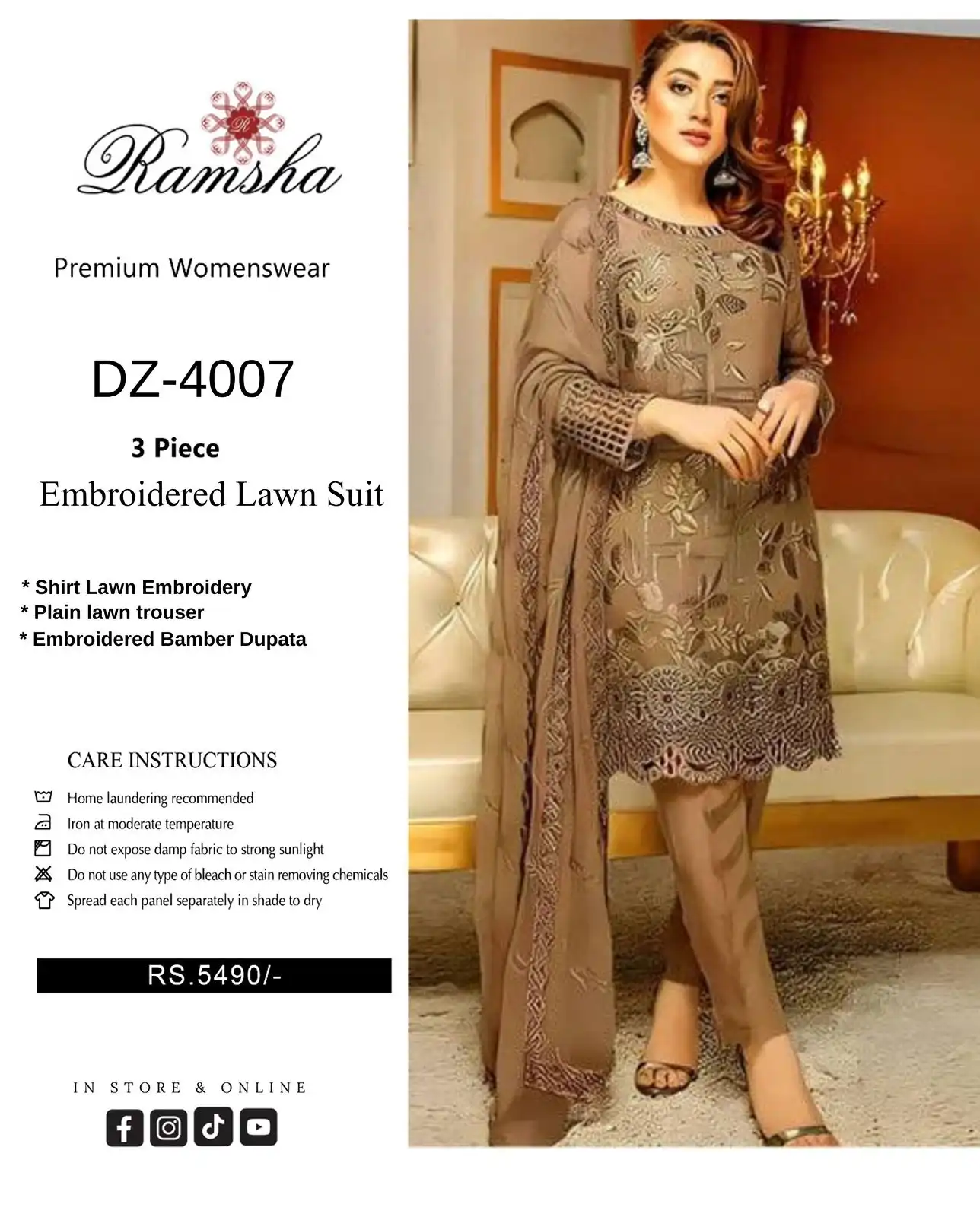 Step into a world of timeless elegance with the Ramsha Embroidered Lawn Suit (Design 4007). This exquisite ensemble is designed for the woman who appreciates fine craftsmanship and luxurious comfort. Perfect for festive occasions, dinner parties, or any event where you want to make a lasting impression.