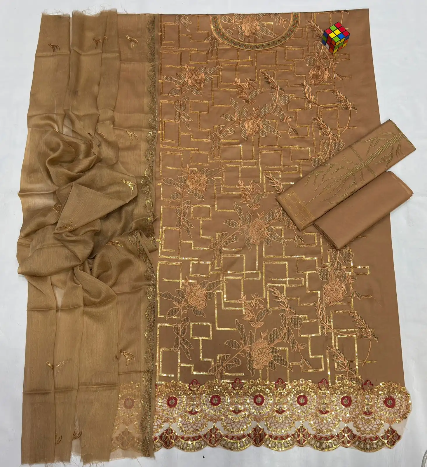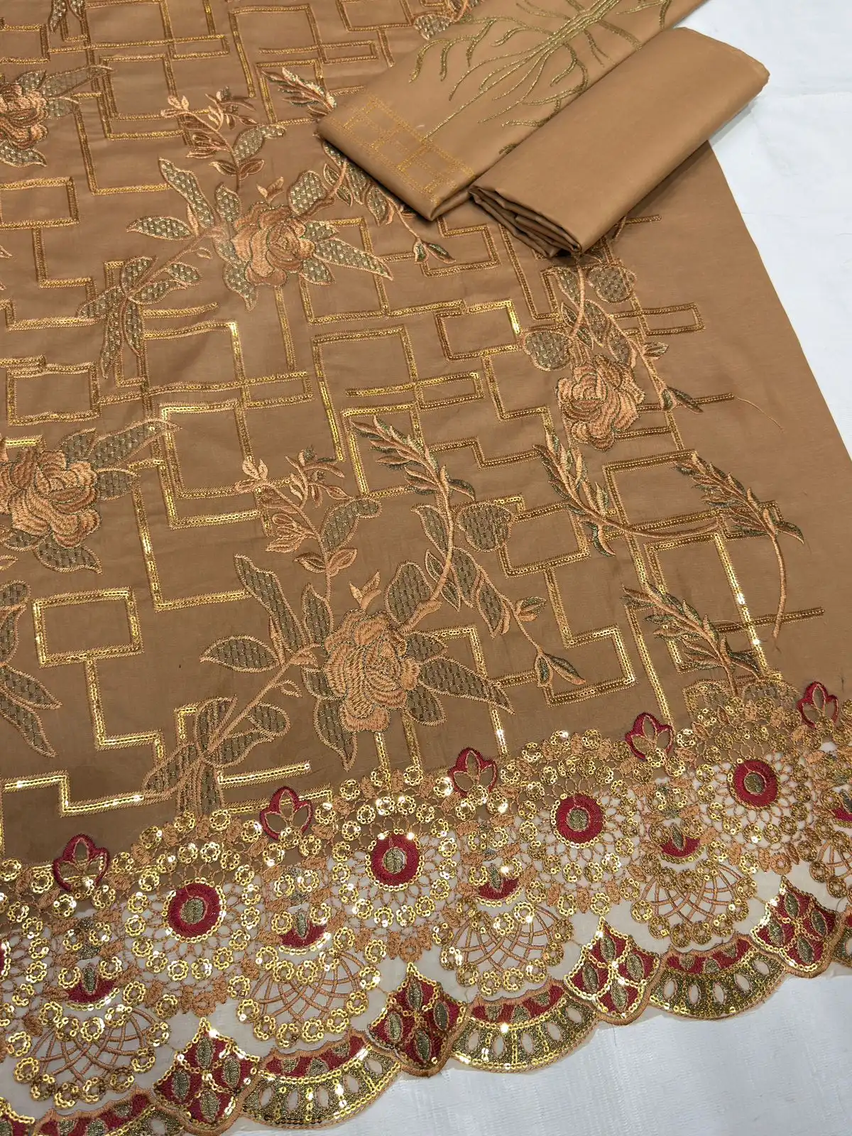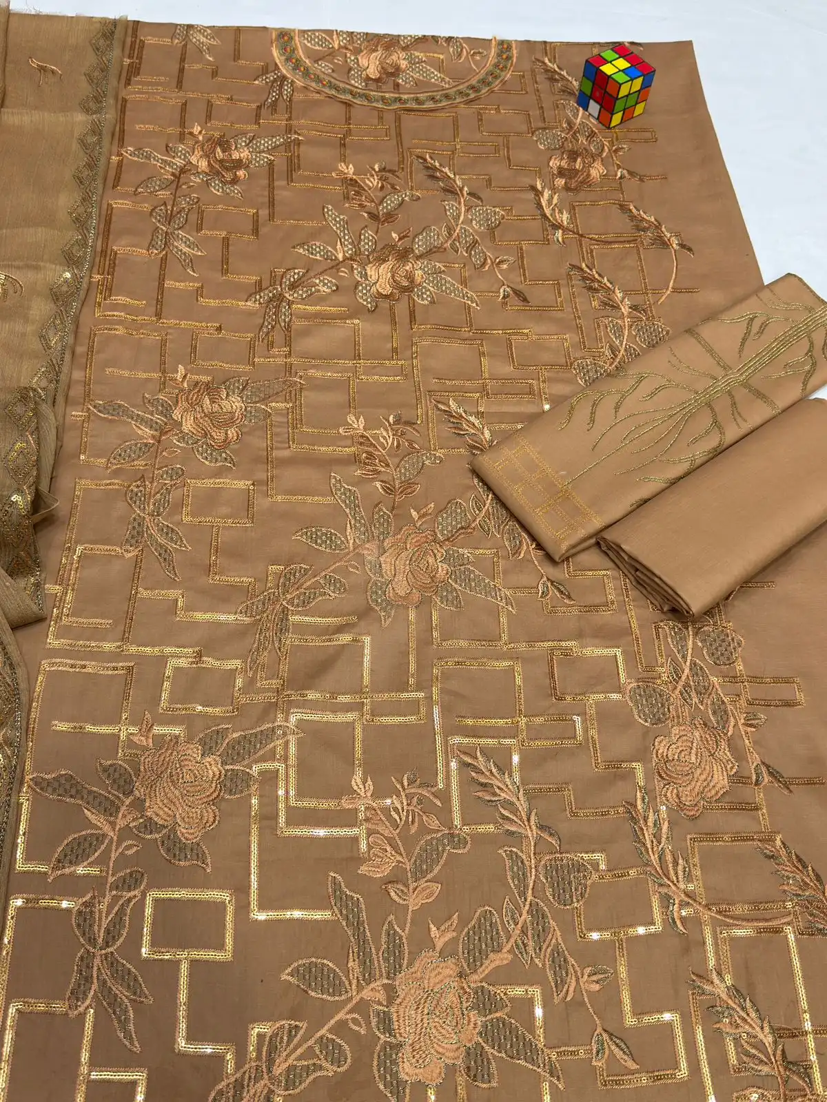 No traditional outfit is complete without a beautiful dupatta. This suit includes a luxurious Bamber chiffon embroidered dupatta. It features elegant borders and heavy embroidery work, transforming it from a simple accessory into a statement piece that elevates the entire outfit.